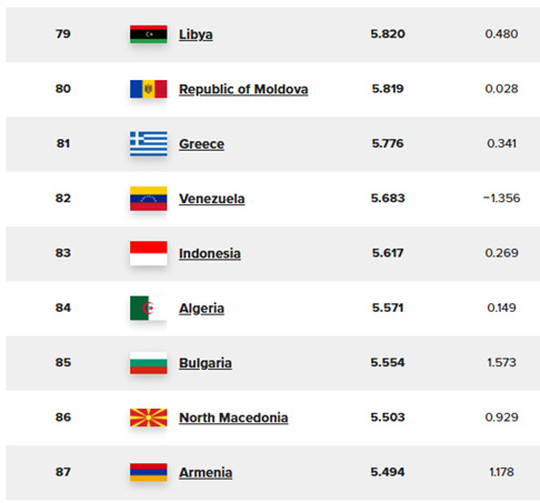 [2] https://data.worldhappiness.report/table. The table also shows scores for a variety of factors related to well-being which are not part of the index, and which are not explained anywhere, as far as I could determine. I find it intriguing that Libya, much of which is subject to constant violence by dueling warlords, would have a higher ranking than Greece, and that Venezuela – from which roughly a quarter of the nation’s population have fled in desperation – would score better than many relatively peaceful countries.