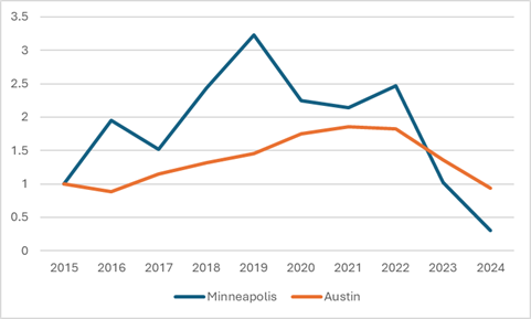 Figure 4: Building permits by year in Austin and Minneapolis relative to 2015 baseline