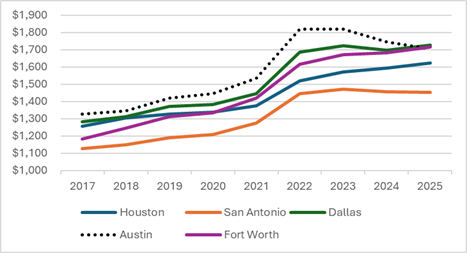Figure 3: Zillow Rental Index for Major Texas Cities 2015-2025
